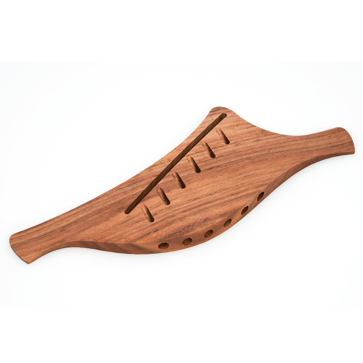 The Lowden fan fret bridge utilises a pin-less design, allowing us to only have one hole in the soundboard! Made from Bocote and machined, this bridge will require shaping and polishing using high grade sand paper and 0000 steel wool (saddles not included).