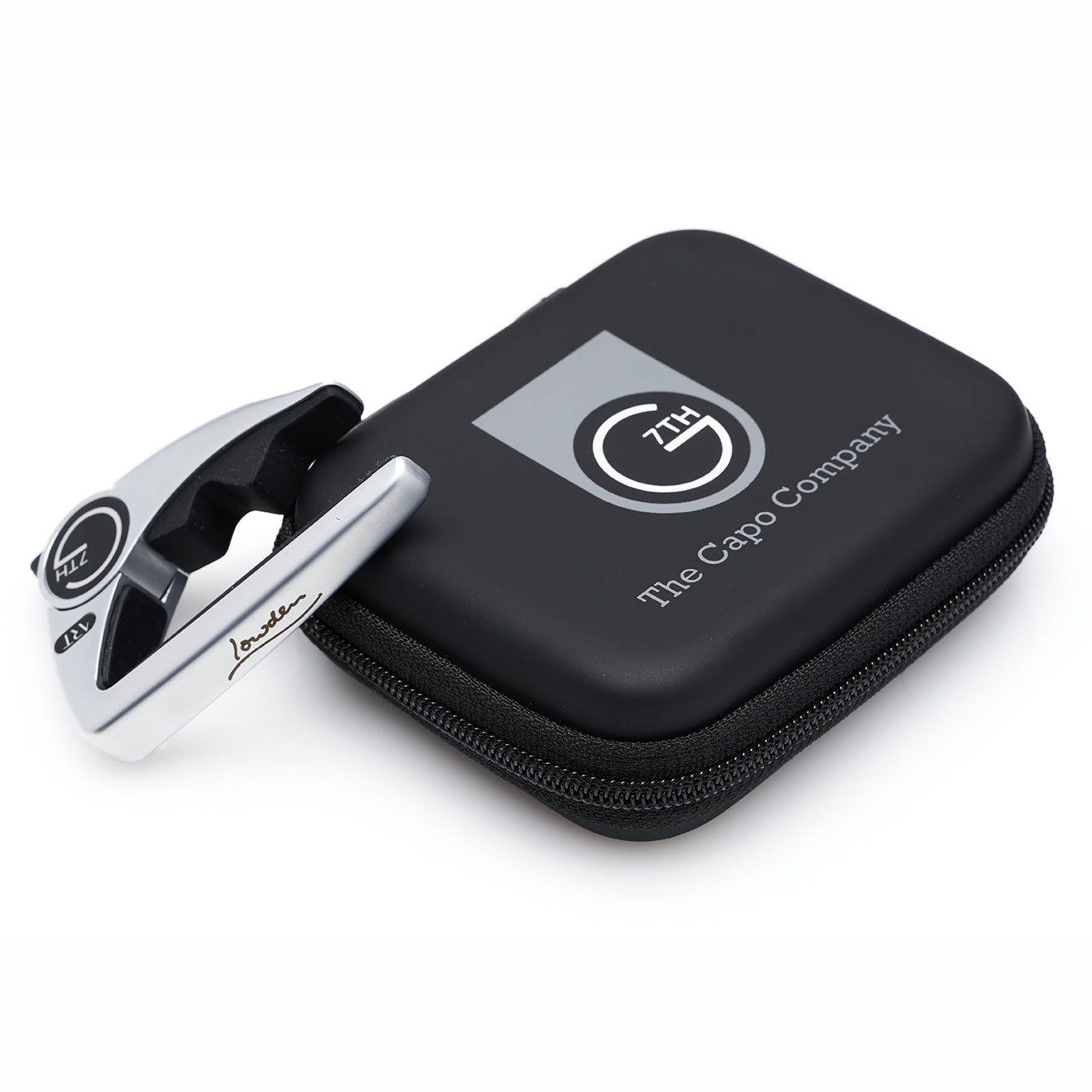 Silver G7th capo with etched Lowden logo and zip case.
