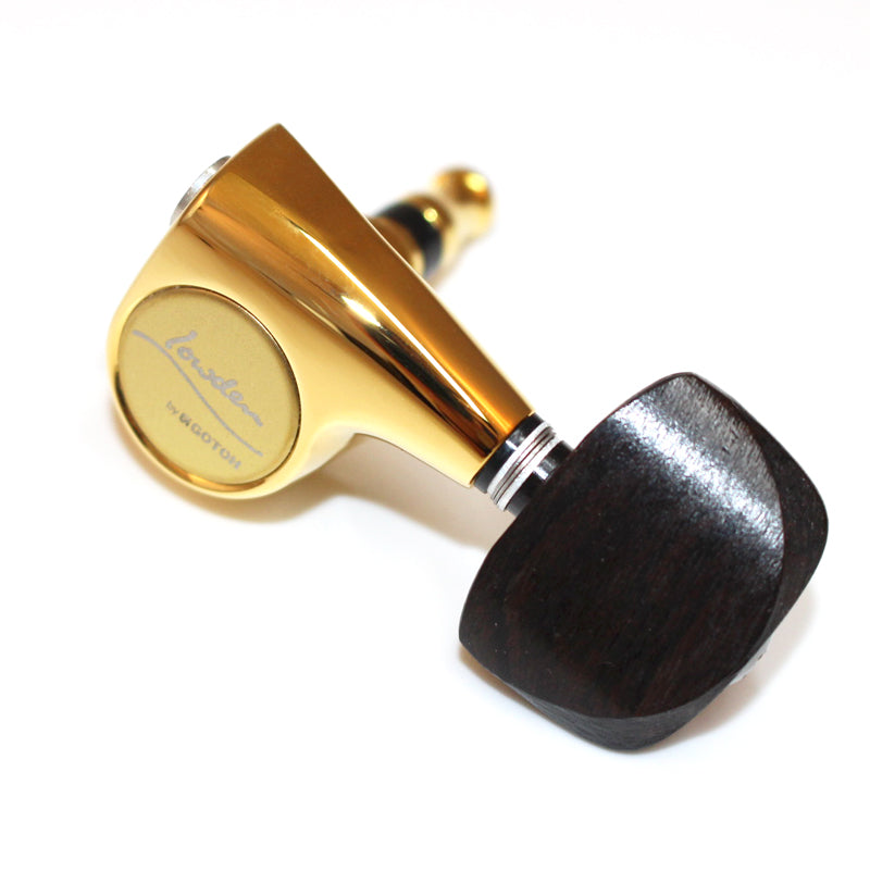 These gold and ebony machine heads from Gotoh have a 1:18 gear ratio, and are part of their SGL510 series. With precision fitting gears and marvellous touch on playing, these tuners have been described by George as 'superb'.